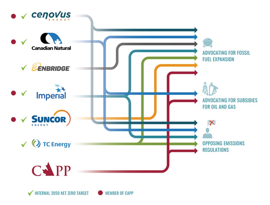 CAPP and all six companies have advocated for measures to increase the role of fossil fuels in Canada, such as pushing for new oil and projects and advocating for financial and regulatory support for the industry. They also appear involved in attempts to weaken emission reduction policies, such as Canada's 2022 oil and gas emissions cap and methane regulations.