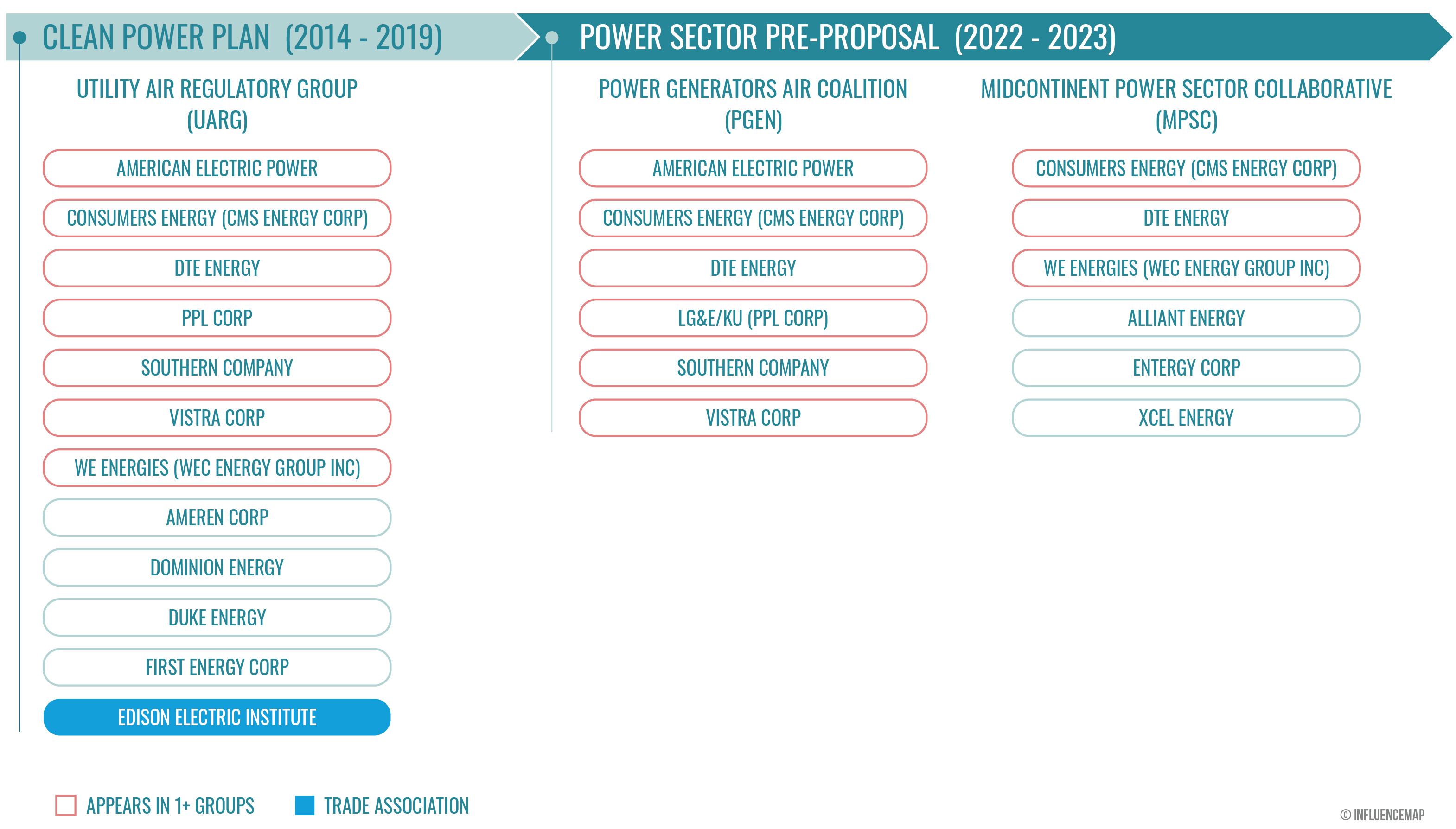 Now, with the introduction of the EPA’s pre-proposal in 2023, InfluenceMap finds that nearly the exact same collective of utilities that fought the CPP are lining up to oppose the Biden Administration’s power plant rules. As illustrated in the graphic below, many of the same electric utilities that opposed the CPP as members of the UARG are engaging negatively on the power sector pre-proposal through other coalitions.
